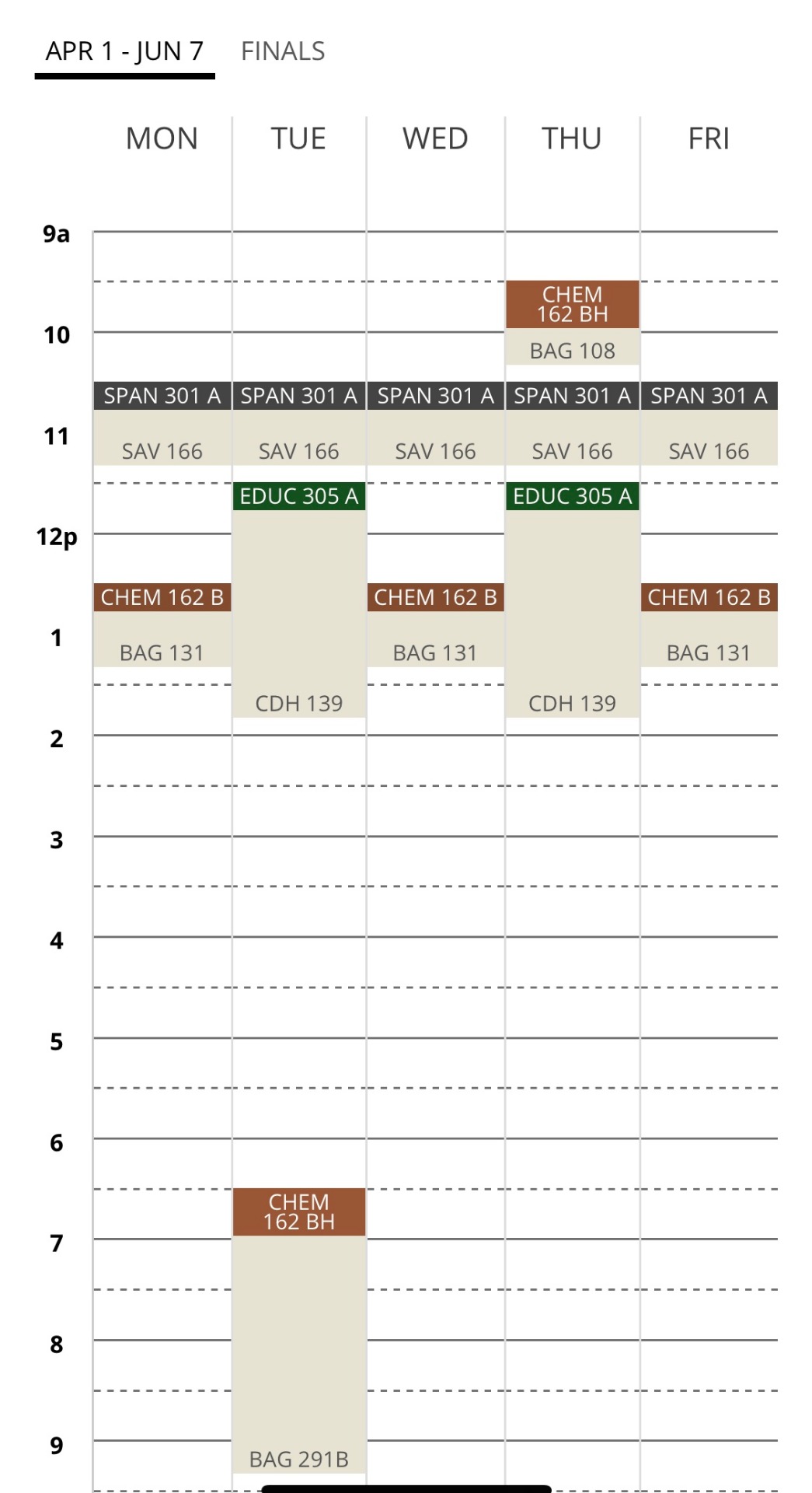 This is my schedule for Spring Quarter. Ignoring my Chemistry Lab, I had an amazing schedule. Starting 10:30 was great (did some homework and review before classes), and ending by 2 was fantastic. This gave me plenty of time to do homework and participate in extracurriculares. This is 18 credits with three credits being an Independent Study through the Disability Studies program, which isn't scheduled.